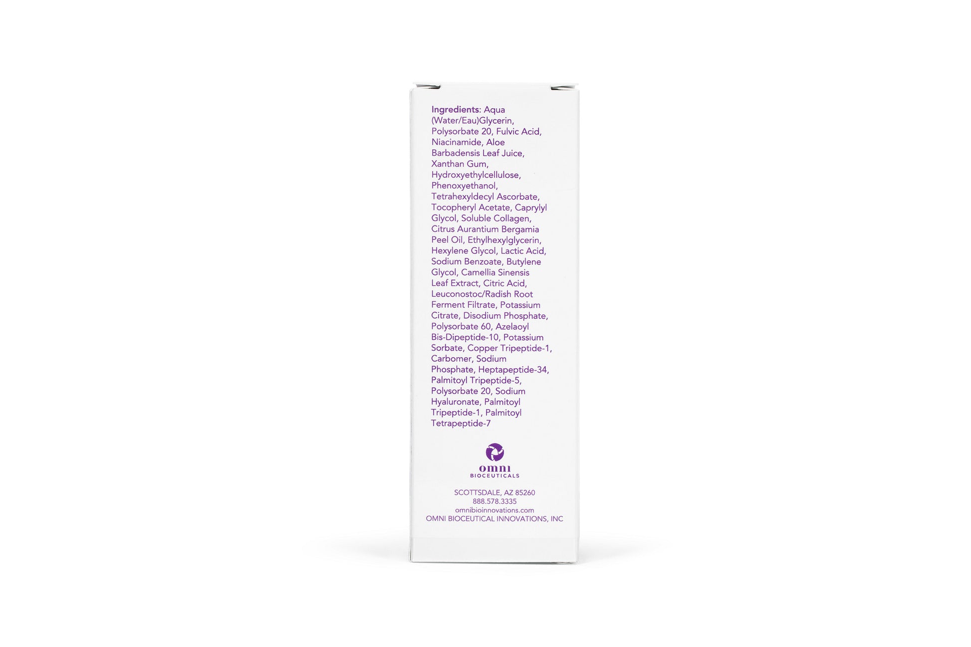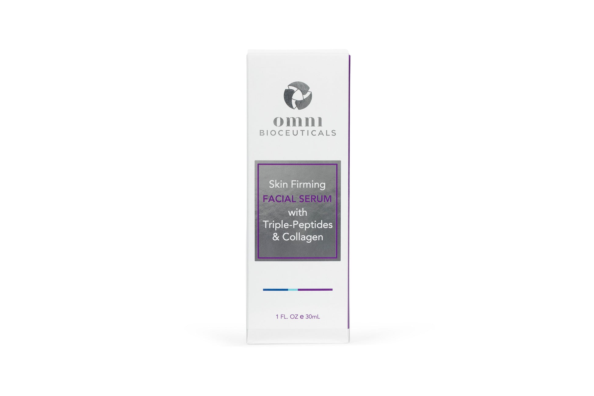 Omni's all new Skin Firming Facial Serum with Tripeptide & Copper Peptide is a medical-grade cellular protein serum that penetrates deeper to support the regeneration of collagen and elastin beneath the surface of the skin using the latest technology in proteins. This unique, exceptional serum protects from and counteracts the signs of intrinsic and extrinsic aging. These proteins help to reduce sagging skin, loss of elasticity, uneven skin tone, fine lines and wrinkles, and thinning of the epidermis, while it increases luminosity, tightens and tones; reduces pore size to maintain and restore a youthful skin appearance. Absorbs quickly to leave a very smooth finish, which does not appear shiny or leave any sticky residue. Great for even the most sensitive skin types, reducing irritation and frequent breakouts. Free of parabens or chemical fragrances..